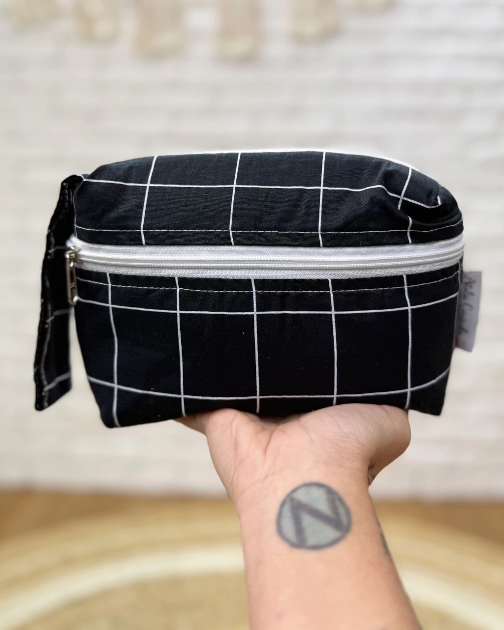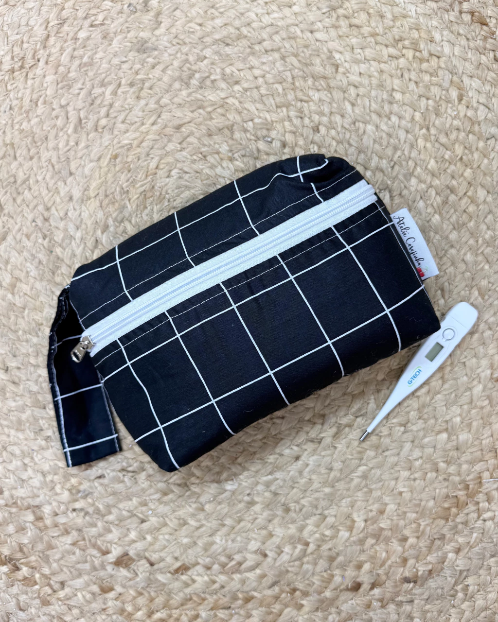 Possui compartimento impermeável que é uma ótima opção para remédios líquidos, com fechamento em ziper + bolso com fechamento em zíper, que é ótimo para guardar termômetro e cartelas. Possui alça para carregar.