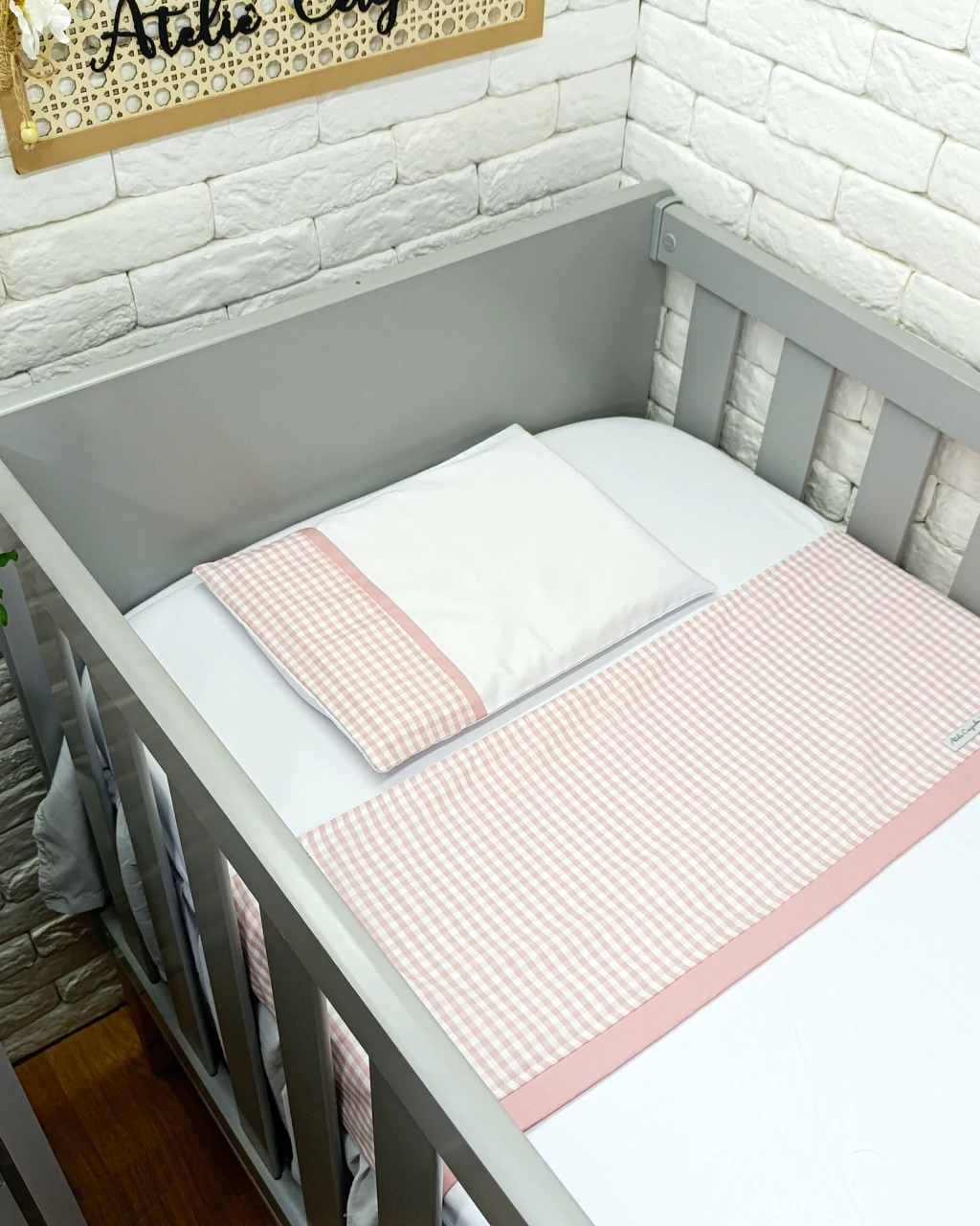 Nosso Jogo de Lençol para Mini Berço de 3 Peças é feito em algodão de alta qualidade, oferecendo suavidade e conforto para o sono do bebê. O kit inclui um lençol com elástico todo branco em malha penteada que não forma bolinhas, um lençol de cima em percal 300 fios com uma barra estampada e uma fronha também em percal com barrinha estampada, combinando com o conjunto. Ideal para compor um enxoval de berço aconchegante e durável.